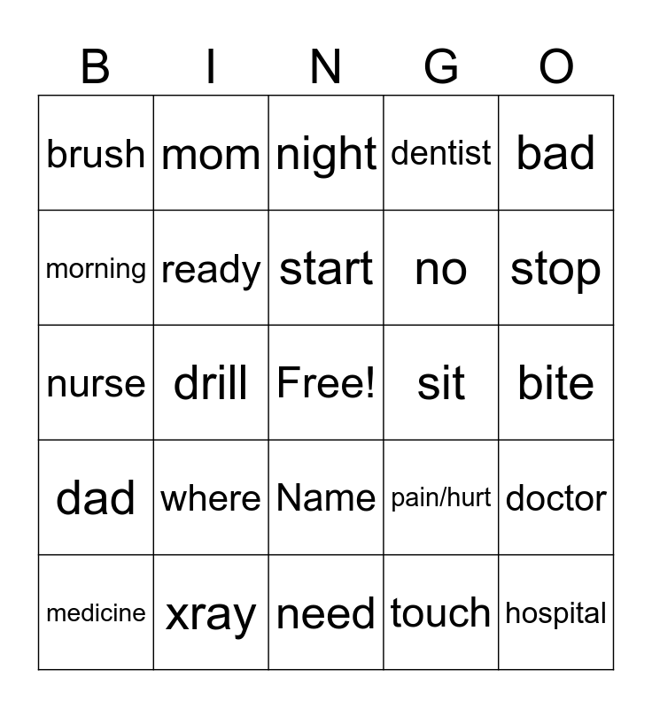 This bingo card has a free space and 27 words: pain/hurt, yes, no, need, morning, night, mom, dad, sit, doctor, nurse, dentist, medicine, xray, stop, scared, ready, start, where, brush, bite, touch, drill, hospital, Name, bad and good.