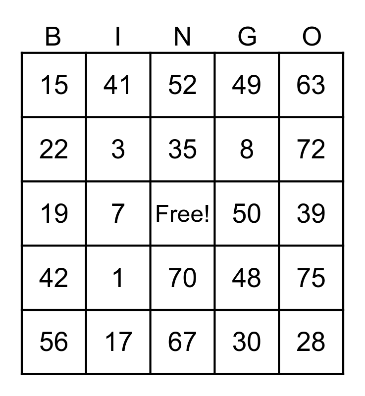 This bingo card has a free space and 24 words: 1, 17, 35, 56, 63, 15, 22, 41, 50, 70, 8, 19, 48, 75, 3, 30, 39, 52, 72, 7, 28, 42, 49 and 67.