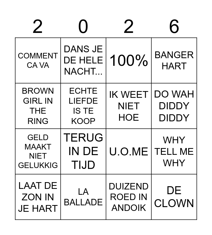 This bingo card has 32 words: TAKE A CHANCE ON ME, ALS IK JOU VERGEEF, WHY TELL ME WHY, LOVE ME DO, DE CLOWN, IK WEET NIET HOE, BROWN GIRL IN THE RING, THE BANJO MAN, DANS JE DE HELE NACHT..., IK HOU VAN HET LEVEN, DO WAH DIDDY DIDDY, 100%, LEEF ALS EEN ZIGEUNER, IN ONS CAFE, LA BALLADE, ALS DE NACHT VERDWIJNT, DAAR IN DAT KLEINE CAFE, U.O.ME, ROSE GARDEN, CALIFORNIA DREAMIN`, IK SPAAR GEEN CENTEN, UW LAATSTE JAS, MENEER, DUIZEND ROED IN ANDOIK, VLIEG MET ME MEE, LAAT DE ZON IN JE HART, BANGER HART, GELD MAAKT NIET GELUKKIG, ECHTE LIEFDE IS TE KOOP, COMMENT CA VA, BLIKKEN DAG, AMARILLO and TERUG IN DE TIJD.