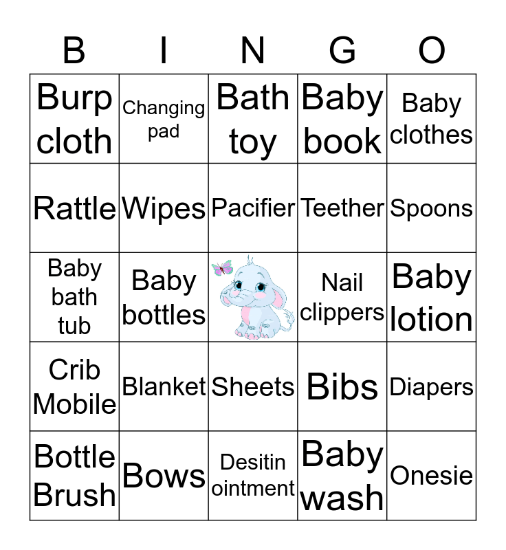 This bingo card has a free space and 24 words: Blanket, Bows, Pacifier, Bottle Brush, Baby clothes, Burp cloth, Rattle, Changing pad, Nail clippers, Sheets, Teether, Baby bath tub, Bibs, Diapers, Wipes, Baby wash, Baby lotion, Bath toy, Spoons, Baby bottles, Onesie, Crib Mobile, Baby book and Desitin ointment.