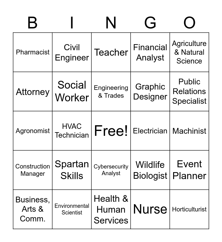 This bingo card has a free space and 25 words: Spartan Skills, Health & Human Services, Engineering & Trades, Business, Arts & Comm., Agriculture & Natural Science, Pharmacist, Attorney, Civil Engineer, Electrician, Cybersecurity Analyst, Graphic Designer, Agronomist, Wildlife Biologist, Event Planner, Social Worker, Meteorologist, Machinist, Teacher, Public Relations Specialist, HVAC Technician, Horticulturist, Environmental Scientist, Construction Manager, Financial Analyst and Nurse.
