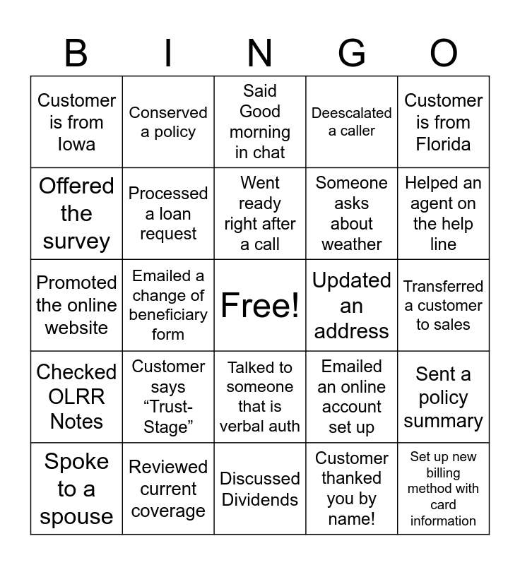 This bingo card has a free space and 24 words: Customer says “Trust-Stage”, Reviewed current coverage, Went ready right after a call, Spoke to a spouse, Customer is from Florida, Customer is from Iowa, Offered the survey, Conserved a policy, Updated an address, Talked to someone that is verbal auth, Someone asks about weather, Promoted the online website, Emailed an online account set up, Sent a policy summary, Processed a loan request, Customer thanked you by name!, Transferred a customer to sales, Said Good morning in chat, Helped an agent on the help line, Emailed a change of beneficiary form, Set up new billing method with card information, Checked OLRR Notes, Deescalated a caller and Discussed Dividends.