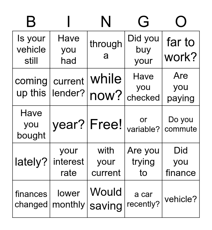This bingo card has a free space and 65 words: How’s your, current car, working for you?, Did you finance, your auto, somewhere else?, Have you had, your car for a, while now?, Are you happy, with your current, payment?, Do you commute, far to work?, Any big purchases, coming up this, year?, Is your vehicle still, under warranty?, Have you checked, your interest rate, lately?, Did you buy your, car new or used?, Do you have more, than one vehicle?, How long do you, plan to keep your, vehicle?, Have your, finances changed, since you bought, your car?, FREE SPACE, Are you trying to, lower monthly, expenses?, Have you bought, a car recently?, Do you like your, current lender?, Is your rate fixed, or variable?, Have you ever, refinanced a, vehicle before?, Are you paying, extra each month?, Who helped you, finance your car?, Do you still owe, quite a bit on your, auto?, Would saving, interest be helpful, right now?, Was your loan, through a, dealership?, Are you bundling, products with one, bank?, Would you be, open to a quick and rate review?.