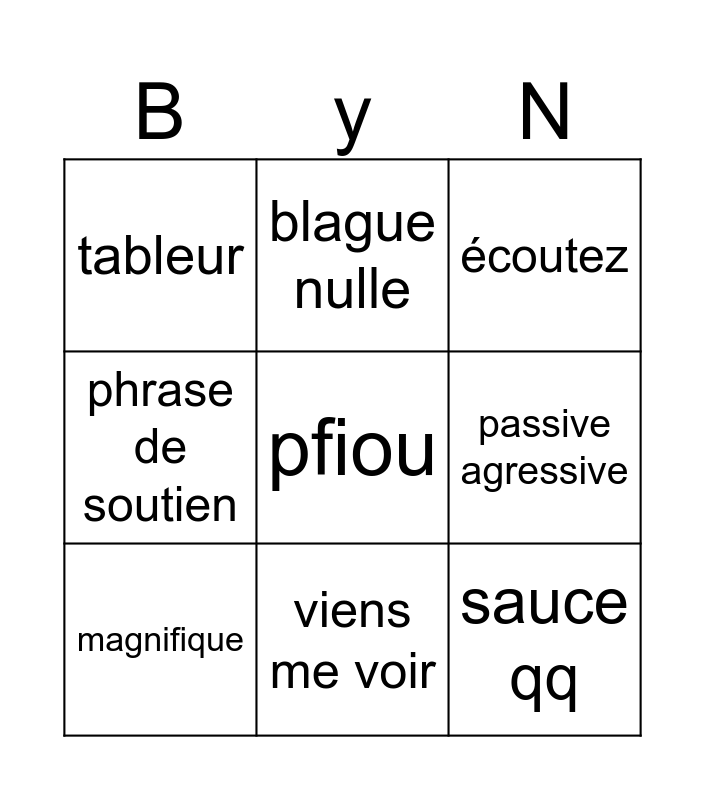 This bingo card has 9 words: magnifique, pfiou, écoutez, tableur, blague nulle, passive agressive, phrase de soutien, viens me voir and sauce qq.