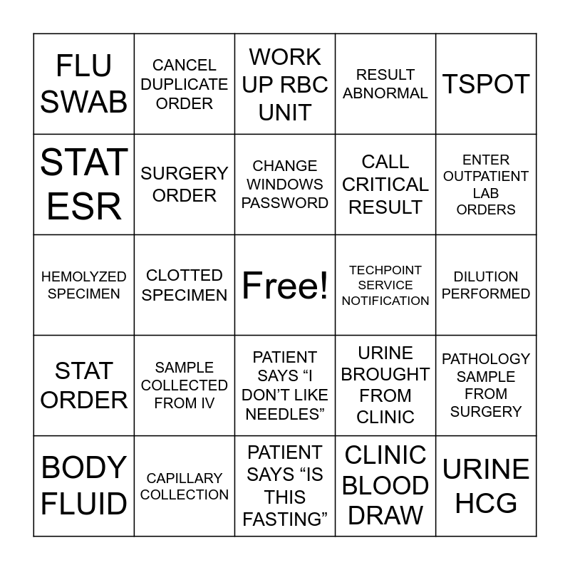 This bingo card has a free space and 58 words: ARTERIAL COLLECTION, CAPILLARY COLLECTION, HEAL STICK, STAT ORDER, CLINIC BLOOD DRAW, OUTPATIENT ORDER, SURGERY ORDER, ASPIRATION ERROR, CALL CRITICAL RESULT, CALL HYPERCRITICAL RESULT, RESULT ABNORMAL, NURSE CALLS FOR RESULTS, WET PREP, COVID SWAB, STREP SWAB, FLU SWAB, URINE HCG, TSPOT, FILL OUT BLOOD BANK ARM BAND, CHANGE WINDOWS PASSWORD, TECHPOINT SERVICE NOTIFICATION, WORK UP RBC UNIT, BODY FLUID, PATHOLOGY SAMPLE FROM SURGERY, PATHOLOGY SMAPLE FROM CLINC, DILUTION PERFORMED, BLOOD CULTURES, RESULT HEMOCULT, ENTER OUTPATIENT LAB ORDERS, PATIENT SAYS THEY ALWAYS HAVE HARD TIME FINDING VEIN, LEKAING URINE SAMPLE, ANALYZER ALARM, CENTERFUGE ALARM, ADD-ON ORDER -CLINIC (, ANALYZER DOWTIME, COAG QC OUT OF RANGE, POSITIVE BLOOD CULTURE, CLOTTED SPECIMEN, HEMOLYZED SPECIMEN, CROOKED LABEL FROM NURSING, SAMPLE COLLECTED FROM IV, BLOOD COLLECTED FROM CHEMO, URINE BROUGHT FROM CLINIC, URINE BROUGHT FROM ER, STOOL FROM ER, PATIENT SAID THANK YOU FOR BLOOD DRAW, PATIENT SAYS “I DON’T LIKE BLOOD”, PATIENT SAYS “I DON’T LIKE NEEDLES”, PATIENT SAYS “IS THIS FASTING”, PRINTER JAM, LABEL PRINTER OUT, LAB ORDER NOT SIGNED, SODIUM CITRATE NOT FILLED TO LINE, RESULT CORRECTION, CANCEL DUPLICATE ORDER, PROVIDER CANCELED ORDER, STAT ESR and “CAN I ADD ON” -ER.