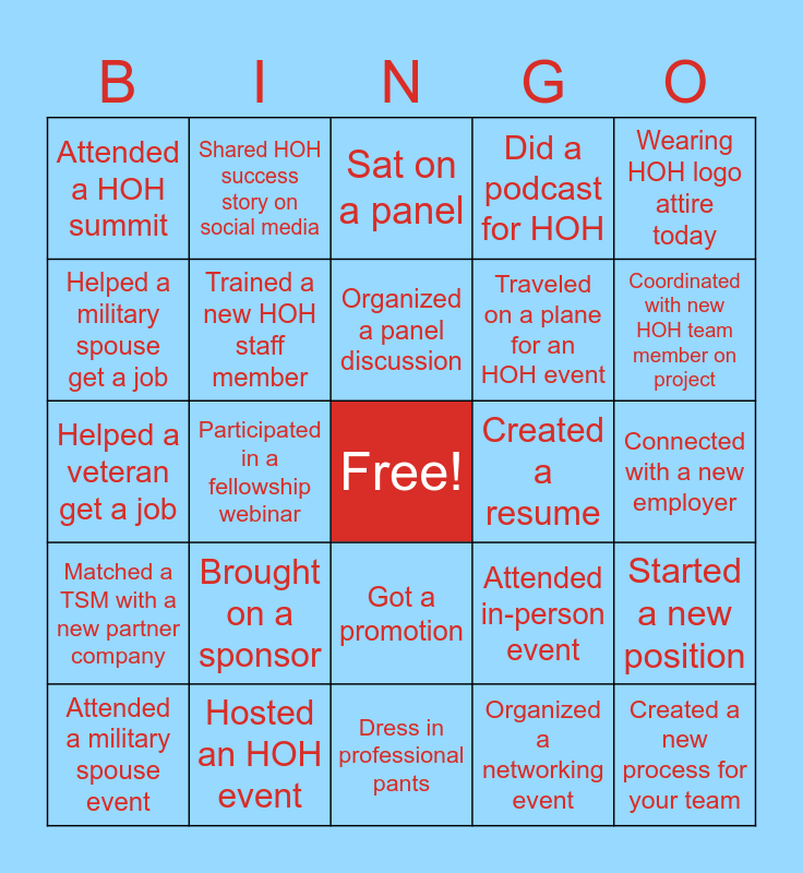 This bingo card has a free space and 24 words: Brought on a sponsor, Hosted an HOH event, Organized a panel discussion, Attended a military spouse event, Wearing HOH logo attire today, Attended a HOH summit, Helped a military spouse get a job, Shared HOH success story on social media, Created a resume, Got a promotion, Traveled on a plane for an HOH event, Helped a veteran get a job, Attended in-person event, Started a new position, Trained a new HOH staff member, Organized a networking event, Connected with a new employer, Sat on a panel, Coordinated with new HOH team member on project, Participated in a fellowship webinar, Created a new process for your team, Matched a TSM with a new partner company, Did a podcast for HOH and Dress in professional pants.