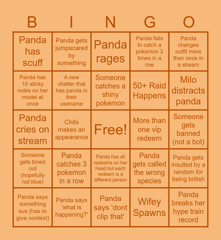 This bingo card has a free space and 24 words: Panda catches 3 pokemon in a row, Panda says 'what is happening?', Someone catches a shiny pokemon, Panda says something sus (has to give context), Panda changes outfit more than once in a stream, Panda has scuff, Panda has 10 sticky notes on her model at once, Panda gets jumpscared by something, More than one vip redeem, Panda has all redeems on her head but each redeem is a different person, 50+ Raid Happens, Panda cries on stream, Panda gets called the wrong species, Panda gets insulted by a random for being british, A new chatter that has panda in their usename, Wifey Spawns, Someone gets banned (not a bot), Panda rages, Milo distracts panda, Chibi makes an appearance, Panda breaks her hype train record, Someone gets timed out (hopefully not blue), Panda fails to catch a pokemon 3 times in a row and Panda says 'dont clip that'.