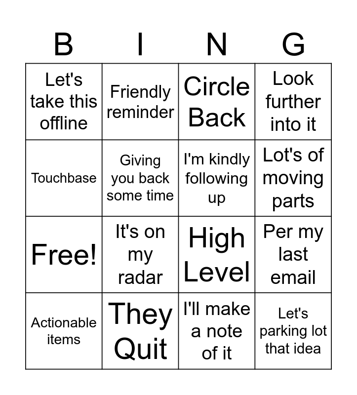 This bingo card has 20 words: Per my last email, At the end of the day, Circle Back, Feel free to jump in, Actionable items, Touchbase, They Quit, Let's take this offline, Free!, Friendly reminder, It's on my radar, High Level, Giving you back some time, Let's parking lot that idea, I'm kindly following up, We decided to pivot in another direction, Lot's of moving parts, Look further into it, I'll make a note of it and Feel Free to jump in.