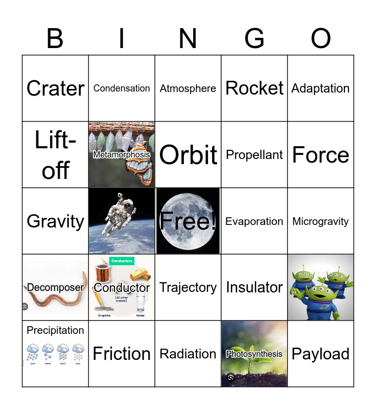 This bingo card has 11 images, a free space and 31 words: Habitat, Photosynthesis, Producer, Consumer, Decomposer, Metamorphosis, Adaptation, Precipitation, Condensation, Erosion, Orbit, Atmosphere, Renewable Resource, Matter, Evaporation, Force, Friction, Gravity, Conductor, Insulator, Trajectory, Splashdown, Crater, Microgravity, Radiation, Payload, Rocket, Artemis II, Propellant, Lift-off and Re_entry.