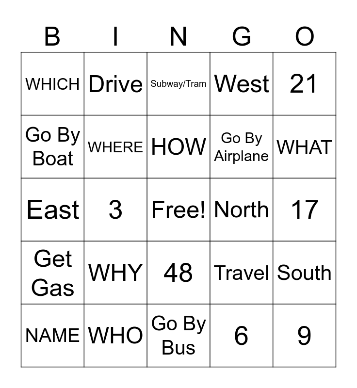 This bingo card has a free space and 27 words: Travel, Go By Train, Go By Airplane, Go By Bus, Go By Boat, Subway/Tram, Drive, Get Gas, North, South, East, West, NAME, WHO, WHAT, WHEN, WHERE, HOW, WHY, WHICH, 17, 6, 3, 9, 48, 21 and 25.