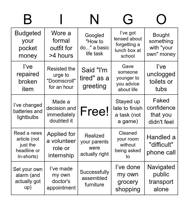 This bingo card has a free space and 29 words: Set your own alarm (and actually got up), I’ve used at least 3 household appliances, Made a decision and immediately doubted it, Folded and put away laundry the same day, Budgeted your pocket money, Googled "How to do..." a basic life task, Resisted the urge to "Doomscroll" for an hour, Applied for a volunteer role or internship, Stayed up late to finish a task (not a game), I’ve made my own doctor's appointment, Faked confidence that you didn't feel, Navigated public transport alone, Successfully assembled furniture, I’ve done my own grocery shopping, I’ve unclogged toilets or tubs, Explained a meme to an adult, Realized your parents were actually right, Read a news article (not just the headline or In-shorts), Bought something with "your own" money, I’ve changed batteries and lightbulbs, Cleaned your room without being asked to, Felt too young and too old at the same time, Gave someone younger to you advice about life, I’ve repaired broken item, I’ve got tensed about forgetting a lunch box at school, Wore a formal outfit for >4 hours, Handled a "difficult" phone call, Said "I'm tired" as a greeting and I’ve worried more for others than for myself.