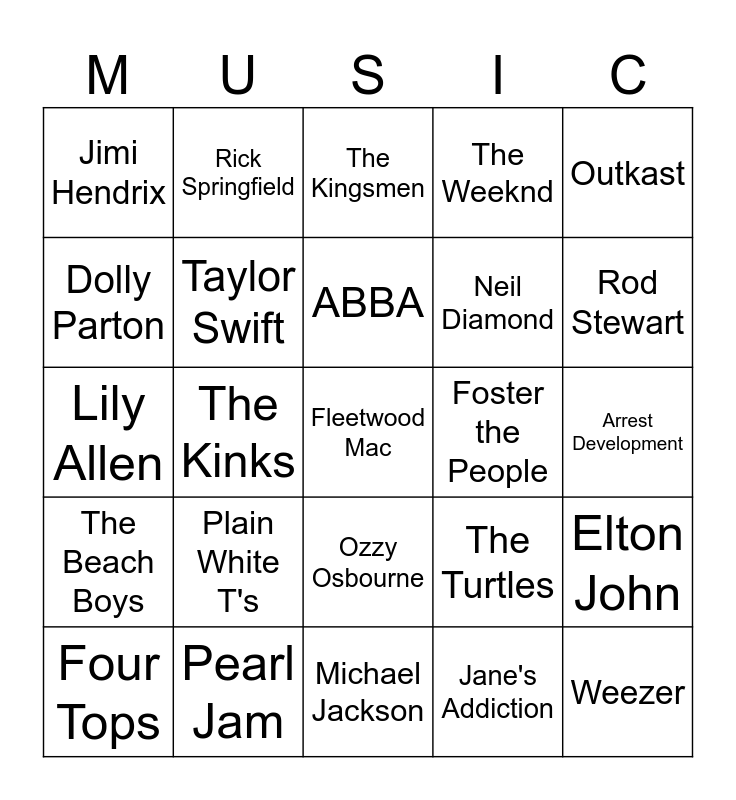 This bingo card has 49 words: Clairo, Fleetwood Mac, Deep Blue Something, Michael Jackson, Plain White T's, The Rolling Stones, Rick Springfield, The Beatles, Dolly Parton, Simon & Garfuckel, Taylor Swift, The Weeknd, Elton John, The Turtles, Dexys Midnight Runners, The Cure, ABBA, Foster the People, The Goo Goo Dolls, Outkast, The Kinks, Jane's Addiction, Jimi Hendrix, Neil Diamond, The Police, Rod Stewart, Four Tops, Steve Perry, Ozzy Osbourne, The Beach Boys, Counting Crows, Little Richard, CCR, Grateful Dead, Pearl Jam, Elvis Costello, Primus, Rick James, Arrest Development, Barry Manilow, Johnny Cash, blink-182, Weezer, The Fratellis, Lily Allen, The Kingsmen, Allman Bros Band, TOTO and Guns N' Roses.
