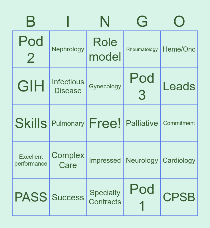 This bingo card has a free space and 48 words: Aerodigestive, CPSB, GPAM, Specialty Contracts, Complex Care, DBP, Nephrology, TISCC, GIH, NICU, Infectious Disease, Rheumatology, Cardiology, Neurology, Neuro/Musc, Allergy, Gynecology, Palliative, Endocrinology, Heme/Onc, Pulmonary, Pod 1, Pod 2, Pod 3, Pod 4, Leads, PASS, Assistant Supervisors, Impressed, Excellent performance, Superstar, Outstanding, Great work, Job well done, Success, Hard work, Dedication, Commitment, Team player, Helpful, Supportive, Positive influence, Role model, Talents, Skills, Creative, Innovative and Insight.