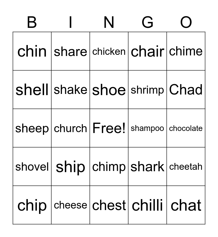This bingo card has a free space and 29 words: shin, cheese, chicken, shirt, chime, chin, shake, shoe, shampoo, cheetah, chip, church, chilli, chat, sheep, shamrock, chest, shark, Chad, shovel, ship, shower, shrimp, chocolate, shell, share, chimp, chair and cherry.