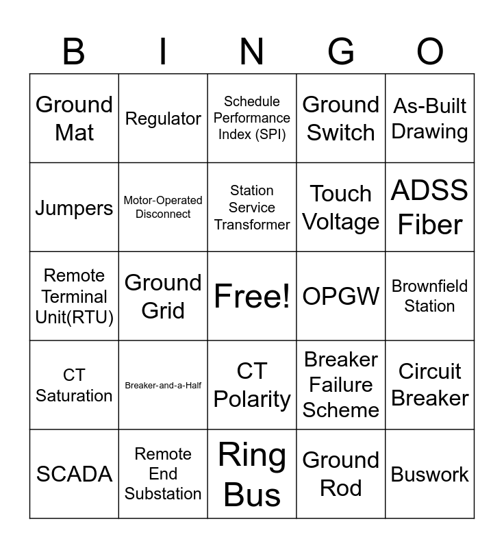 This bingo card has a free space and 48 words: Power Transformer, Buswork, Transfer Bus, Ring Bus, Breaker‑and‑a‑Half, Dead‑End Structure, Regulator, Rigid Bus, Jumpers, Disconnect Switch (DS), Motor‑Operated Disconnect, Ground Switch, Circuit Breaker, Breaker Failure Scheme, Surge Arrester, Wave/Line Trap, Station Service Transformer, OPGW, Line‑to‑Line Fault, As‑Built Drawing, Ground Grid, Ground Rod, Ground Mat, Touch Voltage, Step Voltage, ADSS Fiber, SCADA, Control Cable, CT Polarity, CT Saturation, VT / PT, CCVT, Bus Differential, Radial Feeder, Remote End Substation, Expansion Connection, Greenfield Station, Brownfield Station, Business Protocol Identification, CT, DICM, Cost Performance Index (CPI), Schedule Performance Index (SPI), Sulfur Hexafluoride (SF6), Remote Terminal Unit(RTU), Fault, Tie Breaker and Line‑to‑Ground Fault.