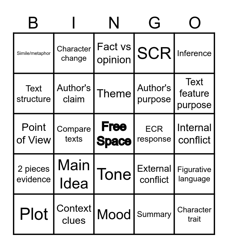 This bingo card has a free space and 24 words: Main Idea, Context clues, Theme, Plot, Inference, Simile/metaphor, Text structure, Character change, ECR response, Tone, Author's purpose, Point of View, External conflict, Figurative language, Author's claim, Summary, Internal conflict, Fact vs opinion, Text feature purpose, Compare texts, Character trait, 2 pieces evidence, SCR and Mood.