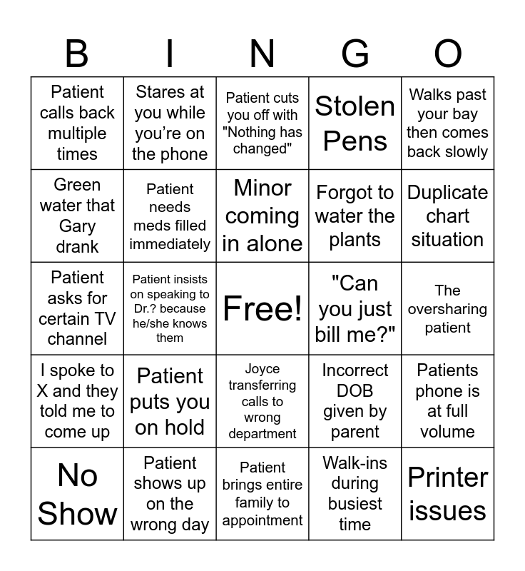This bingo card has a free space and 29 words: No Show, Patient asks for you by name, Patient insists on speaking to Dr.? because he/she knows them, Patient more than 10 minutes late, Patient calls back multiple times, Patient cuts you off with "Nothing has changed", Patient needs meds filled immediately, Patient puts you on hold, "Can you just bill me?", Patient shows up on the wrong day, The oversharing patient, Printer issues, Patient brings entire family to appointment, Walk-ins during busiest time, Duplicate chart situation, Patient has new insurance but no card, Joyce transferring calls to wrong department, I spoke to X and they told me to come up, Walks past your bay then comes back slowly, Patient asks for certain TV channel, Incorrect DOB given by parent, Patient compliments you, Forgot to water the plants, Green water that Gary drank, Stolen Pens, Stares at you while you’re on the phone, Patients phone is at full volume, Minor coming in alone and "It's urgent" (it's not urgent).