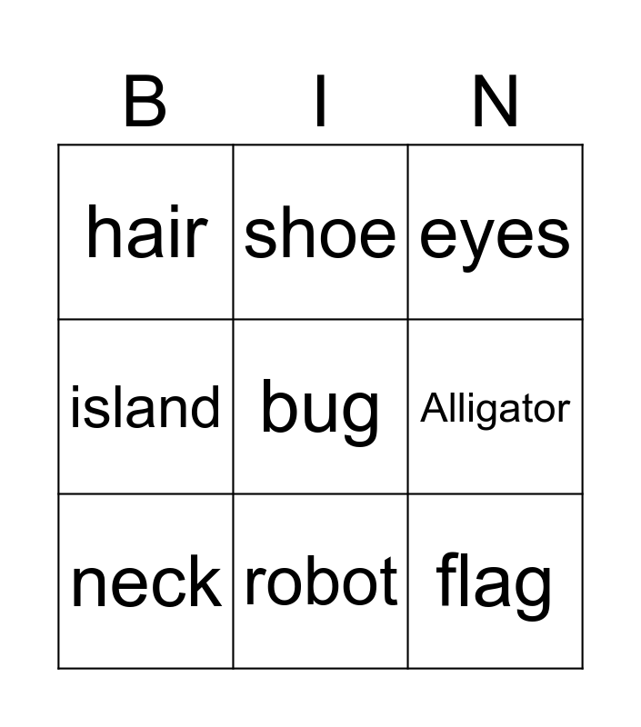 This bingo card has a free space and 8 words: Alligator, eyes, shoe, neck, hair, flag, island and robot.