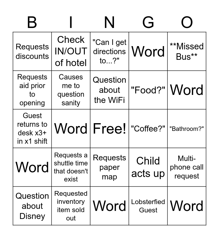 This bingo card has a free space and 24 words: Requests a shuttle time that doesn't exist, Requested inventory item sold out, Question about the WiFi, Question about Disney, **Missed Bus**, Requests discounts, Requests aid prior to opening, Check IN/OUT of hotel, "Coffee?", Requests paper map, "Food?", Guest returns to desk x3+ in x1 shift, Child acts up, Multi-phone call request, Causes me to question sanity, Lobsterfied Guest, "Bathroom?", "Can I get directions to...?", Word, Word, Word, Word, Word and Word.