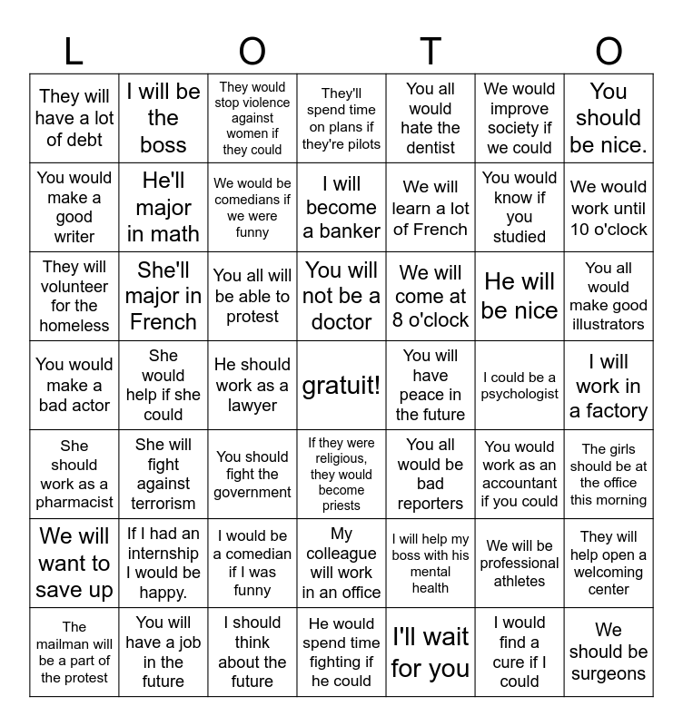 This bingo card has a free space and 55 words: I'll wait for you, You all would make good illustrators, We would create new jobs if we could, They will have a lot of debt, She would help if she could, If I had an internship I would be happy., You should be nice., If you all were chemists, where would you work?, He'll major in math, I would be a comedian if I was funny, They'll spend time on plans if they're pilots, The girls should be at the office this morning, I will work in a factory, I could be a psychologist, The mailman will be a part of the protest, She should work as a pharmacist, You all would hate the dentist, We will learn a lot of French, I would find a cure if I could, You would know if you studied, We would work until 10 o'clock, She will fight against terrorism, We will come at 8 o'clock, They would stop violence against women if they could, I would work at the food bank if I had time, You would make a good writer, He should work as a lawyer, You all should organise a challenge for the doctors, They will volunteer for the homeless, He will be nice, I will be able to improve environmental problems, You would work as an accountant if you could, They will help open a welcoming center, You will have a job in the future, We would improve society if we could, I will become a banker, We will want to save up, She'll major in French, We should be surgeons, You should fight the government, I will be the boss, My colleague will work in an office, I will help my boss with his mental health, She should be nice, You all will be able to protest, You would make a bad actor, I should think about the future, You all would be bad reporters, You will have peace in the future, We would be comedians if we were funny, If they were religious, they would become priests, We will be professional athletes, He would spend time fighting if he could, You will not be a doctor and I will save my money for my internship.