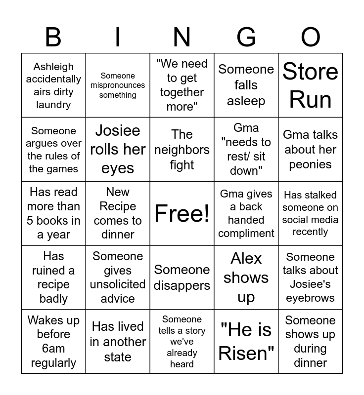 This bingo card has a free space and 50 words: Someone spills on their shirt, Someone shows up during dinner, Someone tries to start a political conversation, Someone tells a story we've already heard, Someone gives unsolicited advice, Someone gets called the wrong name, Someone mispronounces something, Tara talks about cake, Someone argues over the rules of the games, Grandpa prayers >2m, Josiee rolls her eyes, Someone falls asleep, Someone talks about Josiee's eyebrows, Alex shows up, Morgan wears a white shirt, Someone brings a pet, The neighbors fight, Gma gives a back handed compliment, Someone avoids doing the dishes, Store Run, New Recipe comes to dinner, "He is Risen", Ashleigh accidentally airs dirty laundry, Gma "needs to rest/ sit down", Someone asks Michael for tech support, Gpa tells a joke, Gma talks about her peonies, Awkward Silence, "We need to get together more", Someone disappers, Gma yells at Alexa, Cardinal comes to visit, Have traveled to another country, Has broken a bone, Has lived in another state, Has a weird hidden talent, Has gotten a speeding ticket, Has fallen in public, Sent a text to the wrong person, Has stalked someone on social media recently, Has re-gifted something, Loves Peeps, Still gets an easter basket, Has stolen candy from a kid, Wakes up before 6am regularly, Has read more than 5 books in a year, Has been to Vegas, Hates Cilantro, Has ruined a recipe badly and Sends voice memos instead of texts.