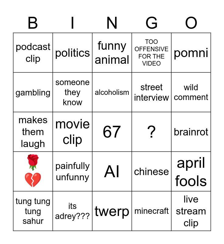 This bingo card has a free space and 24 words: painfully unfunny, its adrey???, alcoholism, tung tung tung sahur, pomni, podcast clip, gambling, politics, ?, AI, street interview, makes them laugh, chinese, april fools, someone they know, minecraft, brainrot, funny animal, wild comment, movie clip, live stream clip, 🌹 💔, TOO OFFENSIVE FOR THE VIDEO and twerp.