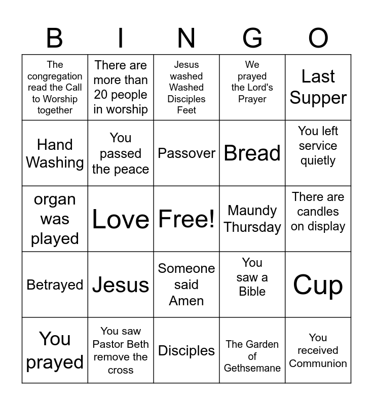 This bingo card has a free space and 24 words: Jesus, You saw Pastor Beth remove the cross, Passover, You prayed, Last Supper, The congregation read the Call to Worship together, Hand Washing, There are more than 20 people in worship, Maundy Thursday, Someone said Amen, Bread, organ was played, You saw a Bible, Cup, You passed the peace, The Garden of Gethsemane, There are candles on display, Jesus washed Washed Disciples Feet, You left service quietly, Love, You received Communion, Betrayed, We prayed the Lord's Prayer and Disciples.