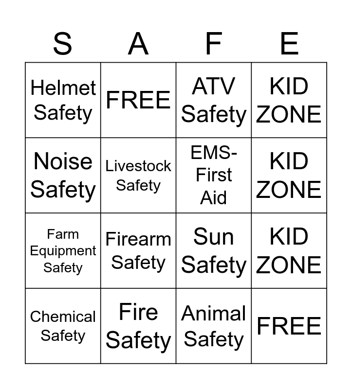 This bingo card has 16 words: Fire Safety, KID ZONE, ATV Safety, Helmet Safety, Farm Equipment Safety, FREE, Sun Safety, Animal Safety, Noise Safety, Livestock Safety, Chemical Safety, KID ZONE, Firearm Safety, KID ZONE, EMS-First Aid and FREE.