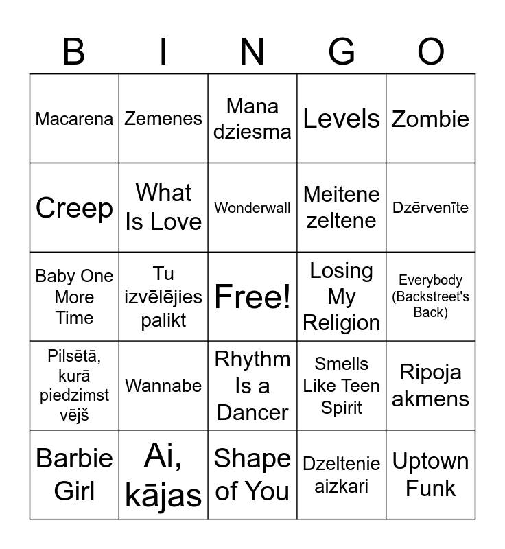 This bingo card has a free space and 24 words: Wannabe, Ai, kājas, Wonderwall, Barbie Girl, Zombie, Macarena, Creep, Zemenes, Losing My Religion, Rhythm Is a Dancer, Meitene zeltene, Baby One More Time, Smells Like Teen Spirit, Ripoja akmens, What Is Love, Dzeltenie aizkari, Everybody (Backstreet's Back), Mana dziesma, Dzērvenīte, Tu izvēlējies palikt, Uptown Funk, Pilsētā, kurā piedzimst vējš, Levels and Shape of You.