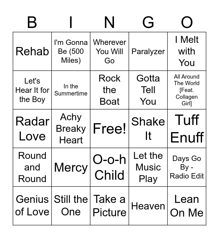 This bingo card has a free space and 40 words: Lotta Love, Radar Love, Werewolves of London, In the Summertime, Still the One, O-o-h Child, Rock the Boat, Let Your Love Flow, I Melt with You, Round and Round, Achy Breaky Heart, Paralyzer, Lean On Me, Tuff Enuff, Shake It, Mercy, New Soul, Rehab, Face Down, Wherever You Will Go, Days Go By - Radio Edit, Heaven, Gotta Tell You, Let's Hear It for the Boy, Somebody's Watching Me, Brandy (You're a Fine Girl), Barely Breathing, All For You, Na Na Hey Hey Kiss Him Goodbye, St. Elmos Fire (Man in Motion), I Know What Boys Like, Genius of Love, It's Raining Men, Let the Music Play, All Around The World [Feat. Collagen Girl], Take a Picture, I'll Be There for You, Spirit In The Sky, I'm Gonna Be (500 Miles) and Sunny Came Home.