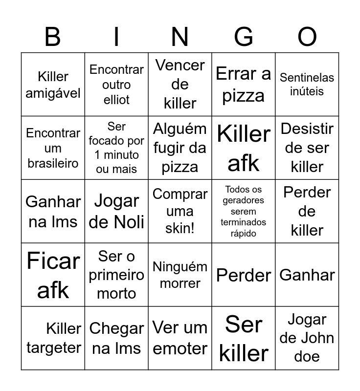 This bingo card has a free space and 24 words: Ser o primeiro morto, Chegar na lms, Alguém fugir da pizza, Killer targeter, Sentinelas inúteis, Killer amigável, Encontrar um brasileiro, Encontrar outro elliot, Todos os geradores serem terminados rápido, Ninguém morrer, Killer afk, Ganhar na lms, Perder, Ganhar, Ser focado por 1 minuto ou mais, Ser killer, Perder de killer, Vencer de killer, Desistir de ser killer, Jogar de Noli, Jogar de John doe, Ficar afk, Errar a pizza and Ver um emoter.