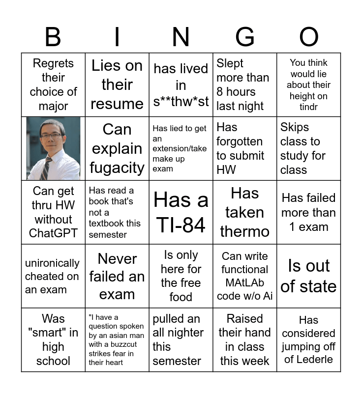 This bingo card has 1 images, a free space and 23 words: Never failed an exam, "I have a question spoken by an asian man with a buzzcut strikes fear in their heart, Has lied to get an extension/take make up exam, Was "smart" in high school, You think would lie about their height on tindr, Regrets their choice of major, Lies on their resume, Has taken thermo, Is only here for the free food, Has forgotten to submit HW, Can get thru HW without ChatGPT, Can write functional MAtLAb code w/o Ai, Is out of state, Can explain fugacity, Raised their hand in class this week, Has failed more than 1 exam, has lived in s**thw*st, Skips class to study for class, Has read a book that's not a textbook this semester, Has considered jumping off of Lederle, unironically cheated on an exam, Slept more than 8 hours last night and pulled an all nighter this semester.