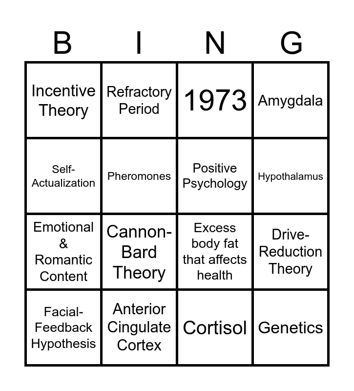 This bingo card has 16 words: Anterior Cingulate Cortex, Drive-Reduction Theory, 1973, Incentive Theory, Emotional & Romantic Content, Refractory Period, Excess body fat that affects health, Cortisol, Self-Actualization, Pheromones, Facial-Feedback Hypothesis, Amygdala, Cannon-Bard Theory, Hypothalamus, Positive Psychology and Genetics.