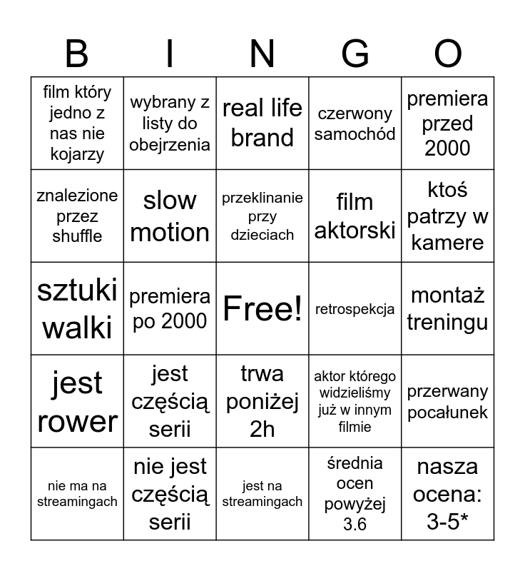This bingo card has a free space and 47 words: nasza ocena: 0.5-2.5*, nasza ocena: 3-5*, scena po napisach, jest na streamingach, jest częścią serii, trwa powyżej 2h, wybrany z listy do obejrzenia, któreś z nas już oglądało, znalezione przez shuffle, obejrzane przez 100k+ osób, slow motion, czerwony samochód, przerwany pocałunek, aktor którego widzieliśmy już w innym filmie, obejrzane przez mniej niż 100k osób, ktoś umiera, przeklinanie przy dzieciach, retrospekcja, główna postać bez rodzica, premiera przed 2000, premiera po 2000, średnia ocen powyżej 3.6, film który jedno z nas nie kojarzy, film aktorski, film animowany, ktoś patrzy w kamere, nie ma na streamingach, średnia ocen poniżej 3.6, trwa poniżej 2h, jest rower, główni bohaterowie mają zwierze, pościg, krew, pokazane landmarks, brak sceny po napisach, nie jest częścią serii, montaż treningu, creditsy na początku, znana piosenka w soundtracku, mądry dzieciak, a romance subplot nobody asked for, real life brand, sztuki walki, głupia postać robi coś mądrego, bloopers, time skip and boże narodzenie.