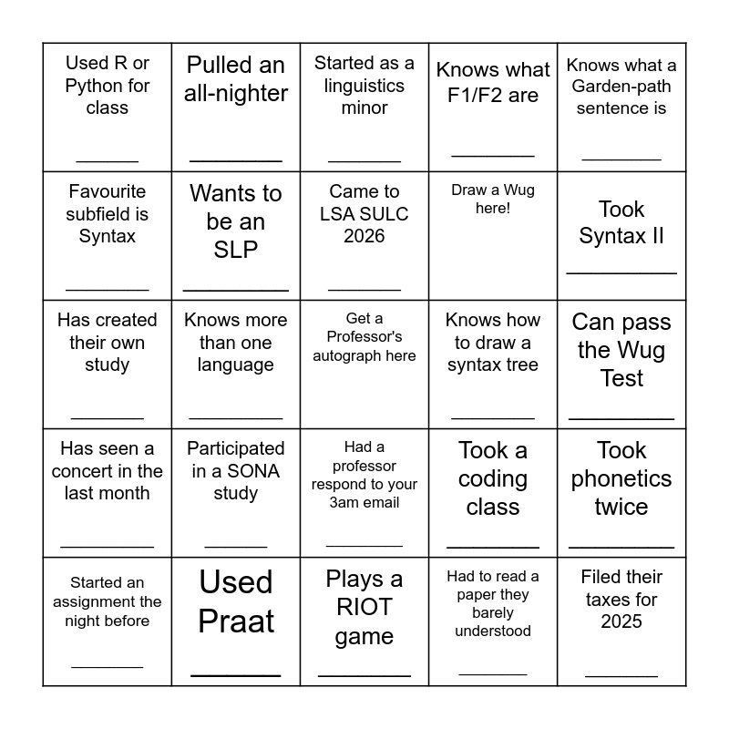 This bingo card has a free space and 24 words: Participated in a SONA study ______, Used Praat _____, Came to LSA SULC 2026 _______, Started an assignment the night before ________, Knows what a Garden-path sentence is ________, Used R or Python for class ______, Favourite subfield is Syntax ________, Pulled an all-nighter _______, Knows how to draw a syntax tree ________, Had a professor respond to your 3am email _________, Draw a Wug here!, Has created their own study _______, Took a coding class _______, Took phonetics twice ________, Wants to be an SLP ________, Had to read a paper they barely understood ________, Can pass the Wug Test ________, Started as a linguistics minor _______, Took Syntax II _________, Knows more than one language _________, Filed their taxes for 2025 _______, Has seen a concert in the last month _________, Knows what F1/F2 are _______ and Plays a RIOT game _______.