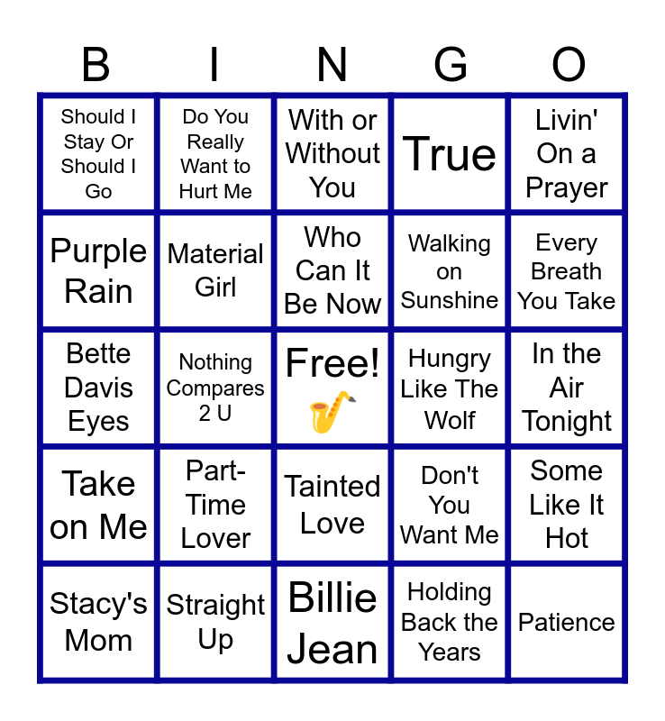 This bingo card has a free space and 24 words: Part-Time Lover, Straight Up, Who Can It Be Now, Stacy's Mom, Livin' On a Prayer, Should I Stay Or Should I Go, Purple Rain, Do You Really Want to Hurt Me, Hungry Like The Wolf, Tainted Love, Walking on Sunshine, Bette Davis Eyes, Don't You Want Me, Some Like It Hot, Material Girl, Holding Back the Years, In the Air Tonight, With or Without You, Every Breath You Take, Nothing Compares 2 U, Patience, Take on Me, True and Billie Jean.