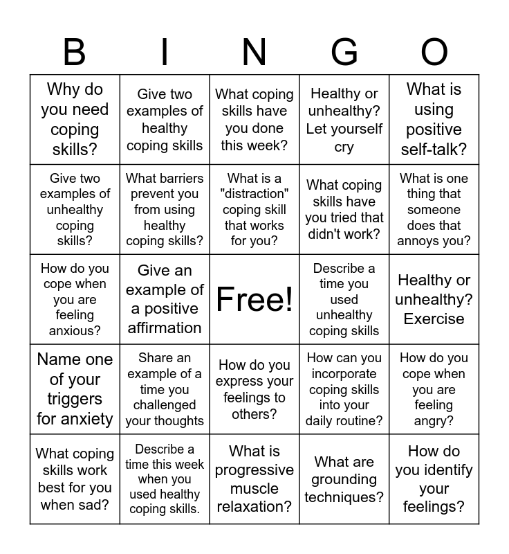 This bingo card has a free space and 27 words: How can you incorporate coping skills into your daily routine?, describe one situation where you lost your cool recently., What coping skills have you tried that didn't work?, What is progressive muscle relaxation?, Give two examples of unhealthy coping skills?, What coping skills have you done this week?, Give two examples of healthy coping skills, Name one of your triggers for anxiety, Describe a time you used unhealthy coping skills, How do you cope when you are feeling angry?, How do you cope when you are feeling anxious?, Healthy or unhealthy? Let yourself cry, What coping skills work best for you when sad?, Describe a time this week when you used healthy coping skills., What is one thing that someone does that annoys you?, How do you cope when you are feeling depressed?, What barriers prevent you from using healthy coping skills?, What is a "distraction" coping skill that works for you?, Share an example of a time you challenged your thoughts, Why do you need coping skills?, Healthy or unhealthy? Exercise, What are grounding techniques?, Give an example of a positive affirmation, How do you identify your feelings?, How do you express your feelings to others?, What is using positive self-talk? and What is your favorite coping skill?.
