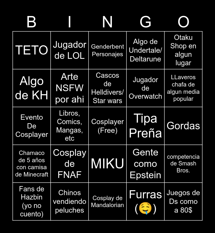 This bingo card has a free space and 24 words: Cosplay de FNAF, Chinos vendiendo peluches, Cascos de Helldivers/ Star wars, Fans de Hazbin (yo no cuento), Otaku Shop en algun lugar, TETO, Algo de KH, Jugador de LOL, Tipa Preña, MIKU, Jugador de Overwatch, Evento De Cosplayer, Gente como Epstein, competencia de Smash Bros., Arte NSFW por ahi, Furras (🤤), Gordas, Genderbent Personajes, LLaveros chafa de algun media popular, Libros, Comics, Mangas, etc, Juegos de Ds como a 80$, Chamaco de 5 años con camisa de Minecraft, Algo de Undertale/ Deltarune and Cosplay de Mandalorian.