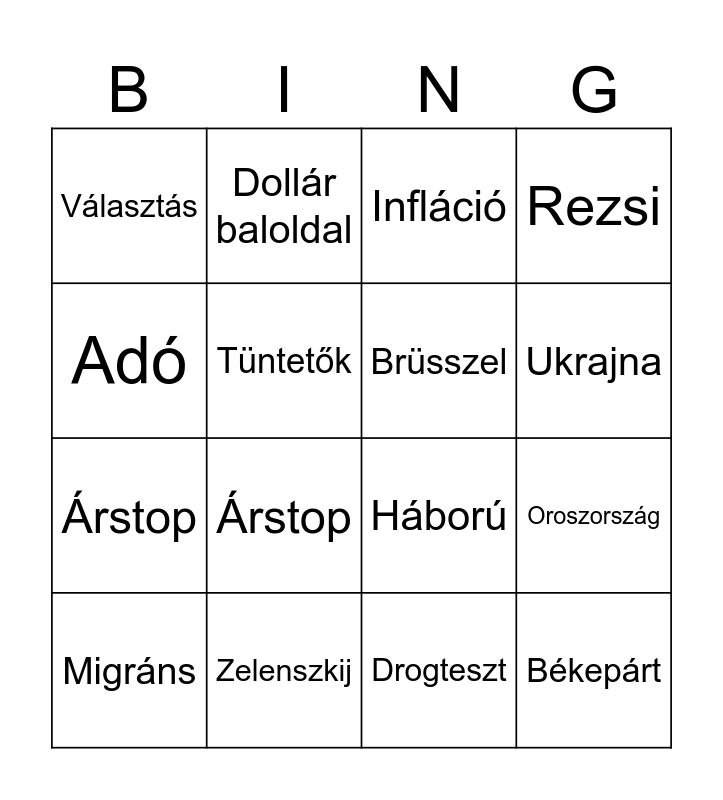 This bingo card has 21 words: Zelenszkij, Hazaáruló, Dollár baloldal, Tisza, Drogteszt, Brüsszel, Választás, Infláció, Háború, Ukrajna, Árstop, Rezsi, Békepárt, Országjárás, Tüntetők, Nyugdíj, Migráns, Árstop, Adó, Oroszország and Szankciók.