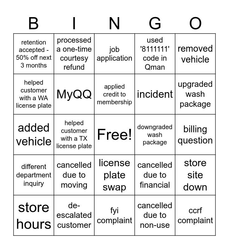 This bingo card has a free space and 25 words: cancelled due to moving, fyi complaint, applied credit to membership, store hours, removed vehicle, retention accepted - 50% off next 3 months, helped customer with a WA license plate, processed a one-time courtesy refund, downgraded wash package, license plate swap, incident, added vehicle, cancelled due to financial, store site down, MyQQ, retention accepted - 1 free month, billing question, job application, upgraded wash package, helped customer with a TX license plate, ccrf complaint, de-escalated customer, different department inquiry, used '8111111' code in Qman and cancelled due to non-use.