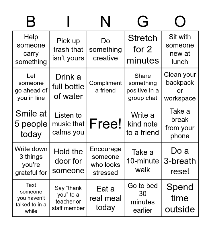 This bingo card has a free space and 24 words: Hold the door for someone, Say “thank you” to a teacher or staff member, Compliment a friend, Text someone you haven’t talked to in a while, Sit with someone new at lunch, Help someone carry something, Let someone go ahead of you in line, Pick up trash that isn’t yours, Write a kind note to a friend, Encourage someone who looks stressed, Share something positive in a group chat, Smile at 5 people today, Take a 10‑minute walk, Do a 3‑breath reset, Drink a full bottle of water, Go to bed 30 minutes earlier, Take a break from your phone, Do something creative, Clean your backpack or workspace, Listen to music that calms you, Spend time outside, Write down 3 things you’re grateful for, Stretch for 2 minutes and Eat a real meal today.
