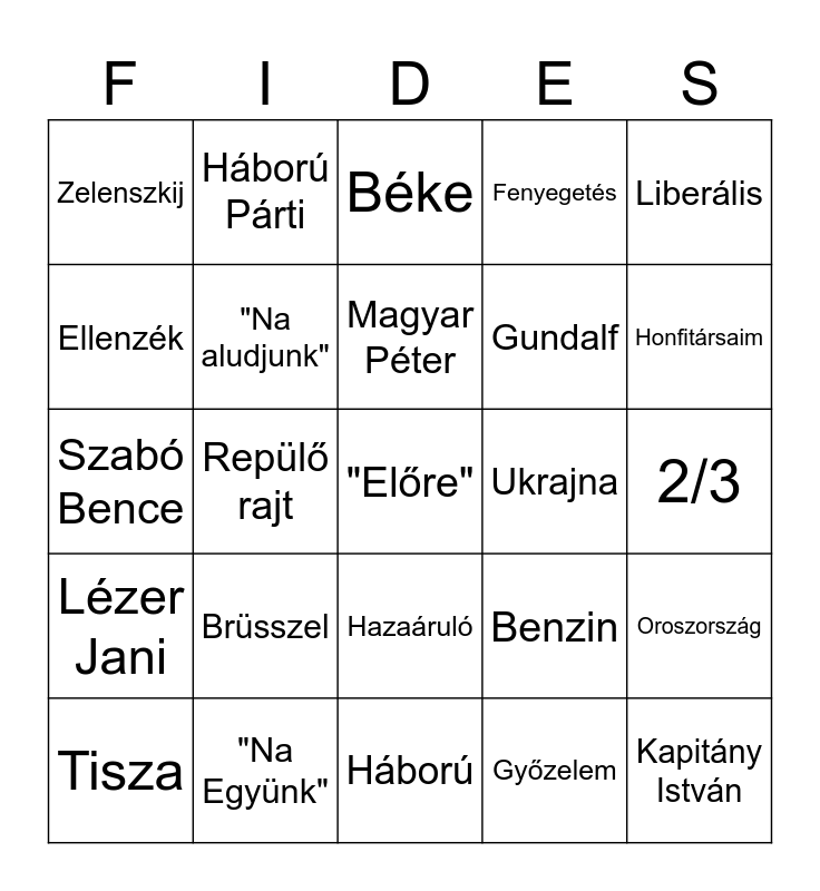 This bingo card has 25 words: Brüsszel, Háború, Magyar Péter, Tisza, Liberális, Zelenszkij, Ellenzék, Háború Párti, Ukrajna, Hazaáruló, Gundalf, Szabó Bence, Benzin, Oroszország, "Na aludjunk", Kapitány István, 2/3, Béke, Honfitársaim, Repülő rajt, "Előre", "Na Együnk", Lézer Jani, Fenyegetés and Győzelem.