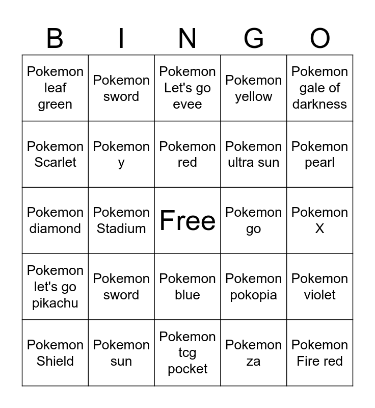 This bingo card has a free space and 24 words: Pokemon sword, Pokemon sun, Pokemon red, Pokemon Shield, Pokemon gale of darkness, Pokemon leaf green, Pokemon Scarlet, Pokemon sword, Pokemon go, Pokemon blue, Pokemon ultra sun, Pokemon diamond, Pokemon pokopia, Pokemon violet, Pokemon y, Pokemon za, Pokemon X, Pokemon Let's go evee, Pokemon pearl, Pokemon Stadium, Pokemon Fire red, Pokemon let's go pikachu, Pokemon yellow and Pokemon tcg pocket.