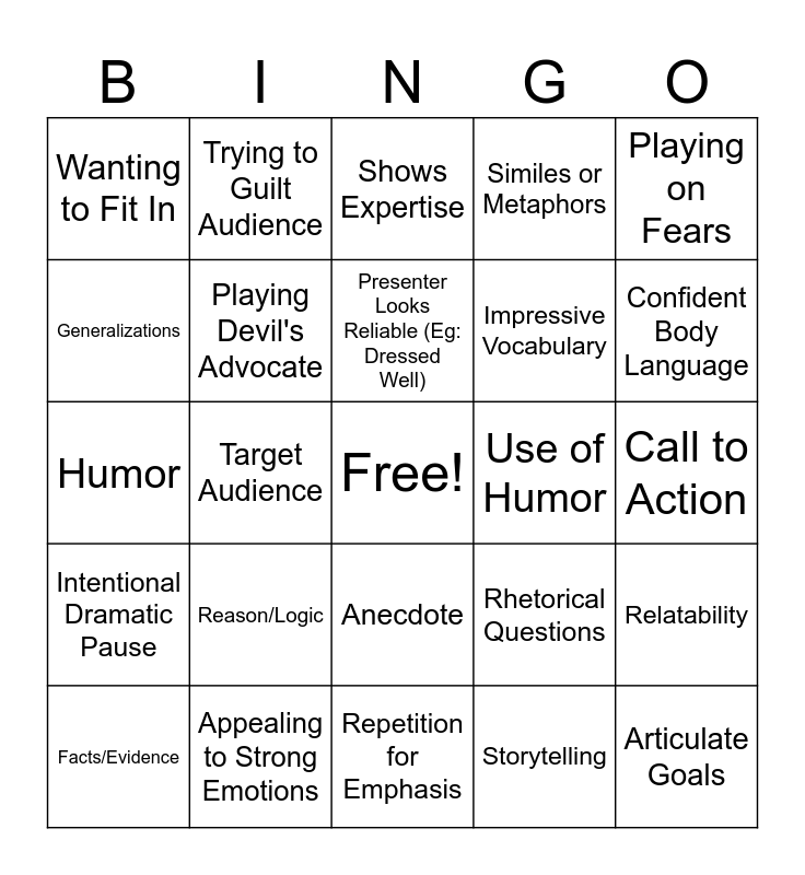 This bingo card has a free space and 24 words: Reason/Logic, Appealing to Strong Emotions, Presenter Looks Reliable (Eg: Dressed Well), Facts/Evidence, Playing on Fears, Wanting to Fit In, Generalizations, Trying to Guilt Audience, Use of Humor, Anecdote, Impressive Vocabulary, Humor, Rhetorical Questions, Relatability, Playing Devil's Advocate, Storytelling, Call to Action, Shows Expertise, Confident Body Language, Target Audience, Articulate Goals, Intentional Dramatic Pause, Similes or Metaphors and Repetition for Emphasis.