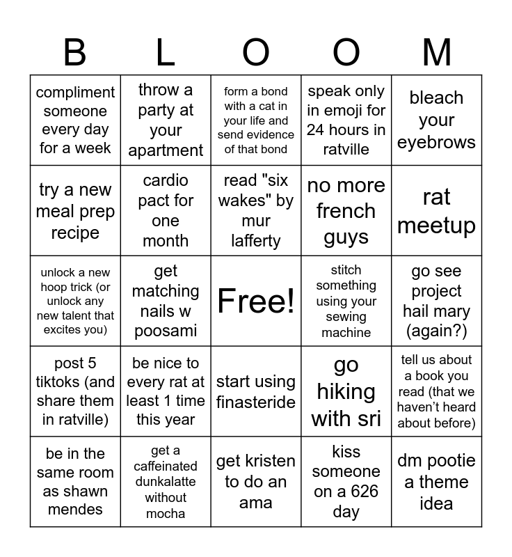 This bingo card has a free space and 24 words: be nice to every rat at least 1 time this year, get a caffeinated dunkalatte without mocha, read "six wakes" by mur lafferty, be in the same room as shawn mendes, bleach your eyebrows, compliment someone every day for a week, try a new meal prep recipe, throw a party at your apartment, stitch something using your sewing machine, start using finasteride, no more french guys, unlock a new hoop trick (or unlock any new talent that excites you), go hiking with sri, tell us about a book you read (that we haven’t heard about before), cardio pact for one month, kiss someone on a 626 day, go see project hail mary (again?), form a bond with a cat in your life and send evidence of that bond, rat meetup, get matching nails w poosami, dm pootie a theme idea, post 5 tiktoks (and share them in ratville), speak only in emoji for 24 hours in ratville and get kristen to do an ama.