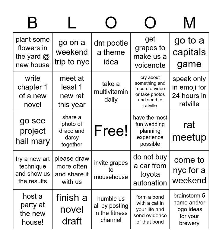 This bingo card has a free space and 24 words: please draw more often and share it with us, finish a novel draft, take a multivitamin daily, host a party at the new house!, go to a capitals game, plant some flowers in the yard @ new house, write chapter 1 of a new novel, go on a weekend trip to nyc, have the most fun wedding planning experience possible, invite grapes to mousehouse, cry about something and record a video or take photos and send to ratville, go see project hail mary, do not buy a car from toyota autonation, come to nyc for a weekend, meet at least 1 new rat this year, form a bond with a cat in your life and send evidence of that bond, rat meetup, dm pootie a theme idea, speak only in emoji for 24 hours in ratville, share a photo of draco and darcy together, brainstorm 5 name and/or logo ideas for your brewery, try a new art technique and show us the results, get grapes to make us a voicenote and humble us all by posting in the fitness channel.
