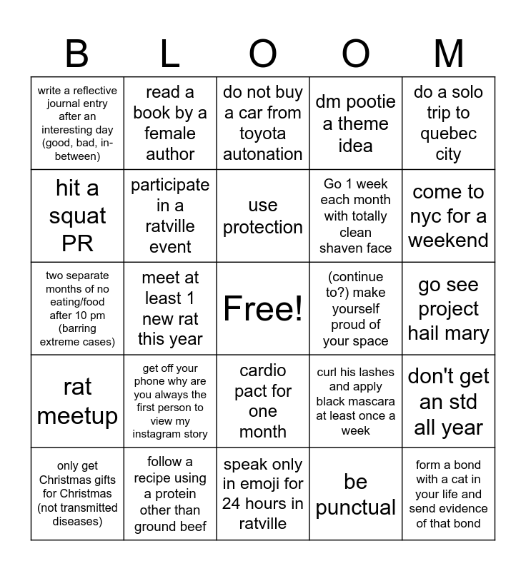 This bingo card has a free space and 24 words: get off your phone why are you always the first person to view my instagram story, follow a recipe using a protein other than ground beef, use protection, only get Christmas gifts for Christmas (not transmitted diseases), do a solo trip to quebec city, write a reflective journal entry after an interesting day (good, bad, in-between), hit a squat PR, read a book by a female author, (continue to?) make yourself proud of your space, cardio pact for one month, Go 1 week each month with totally clean shaven face, two separate months of no eating/food after 10 pm (barring extreme cases), curl his lashes and apply black mascara at least once a week, don't get an std all year, participate in a ratville event, be punctual, go see project hail mary, do not buy a car from toyota autonation, come to nyc for a weekend, meet at least 1 new rat this year, form a bond with a cat in your life and send evidence of that bond, rat meetup, dm pootie a theme idea and speak only in emoji for 24 hours in ratville.
