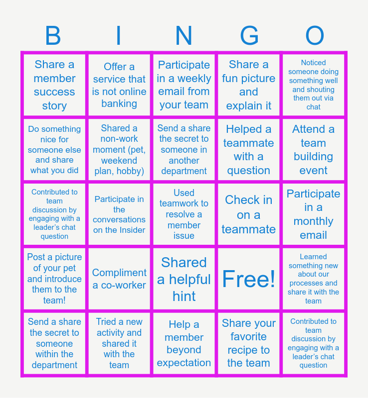 This bingo card has 25 words: Compliment a co-worker, Help a member beyond expectation, Send a share the secret to someone in another department, Send a share the secret to someone within the department, Noticed someone doing something well and shouting them out via chat, Share a member success story, Do something nice for someone else and share what you did, Offer a service that is not online banking, Check in on a teammate, Shared a helpful hint, Helped a teammate with a question, Contributed to team discussion by engaging with a leader’s chat question, Free!, Learned something new about our processes and share it with the team, Shared a non‑work moment (pet, weekend plan, hobby), Contributed to team discussion by engaging with a leader’s chat question, Participate in a monthly email, Participate in a weekly email from your team, Attend a team building event, Participate in the conversations on the Insider, Used teamwork to resolve a member issue, Tried a new activity and shared it with the team, Post a picture of your pet and introduce them to the team!, Share a fun picture and explain it and Share your favorite recipe to the team.