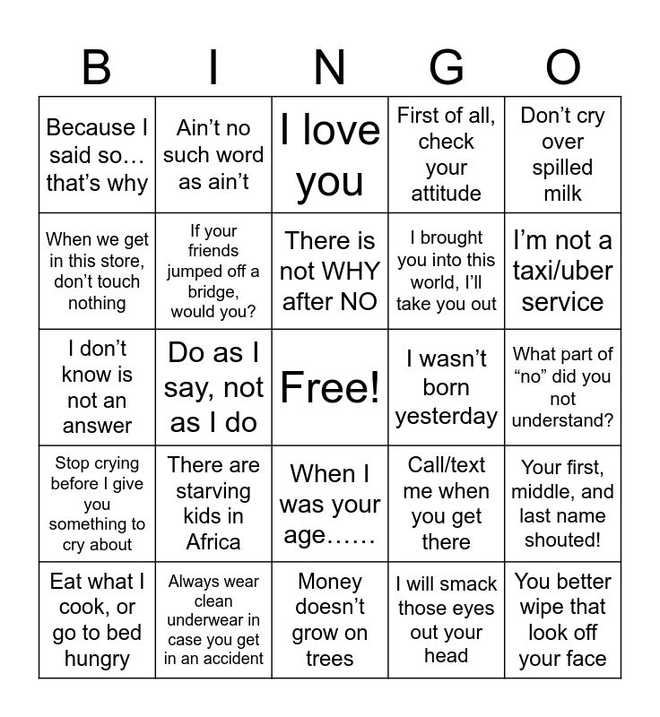 This bingo card has a free space and 31 words: Money doesn’t grow on trees, I’m not the maid, Do as I say, not as I do, Did that sound like you had a choice?, Because I said so…that’s why, I love you, If your friends jumped off a bridge, would you?, Call/text me when you get there, I wasn’t born yesterday, I will smack those eyes out your head, What part of “no” did you not understand?, You better wipe that look off your face, Ask a stupid question; get a stupid answer, When you have kids, you’ll understand, I’m not a taxi/uber service, My house, my rules, Your first, middle, and last name shouted!, There are starving kids in Africa, Stop crying before I give you something to cry about, When I was your age……, Don’t cry over spilled milk, You made your bed now lay in it!, Eat what I cook, or go to bed hungry, Ain’t no such word as ain’t, I brought you into this world, I’ll take you out, When we get in this store, don’t touch nothing, First of all, check your attitude, I don’t know is not an answer, Always wear clean underwear in case you get in an accident, There is not WHY after NO and To sick for school; to sick to go outside.