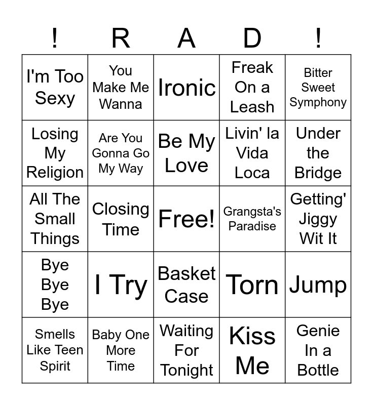 This bingo card has a free space and 40 words: All Star, All The Small Things, Always Be My Baby, Are You Gonna Go My Way, Baby One More Time, Basket Case, Be My Love, Because You Love Me, Bitter Sweet Symphony, Bye Bye Bye, Closing Time, Freak On a Leash, Genie In a Bottle, Getting' Jiggy Wit It, Grangsta's Paradise, I Try, I Want It That Way, I'm Too Sexy, Insane in the Brain, Ironic, Jump, Kiss Me, Livin' la Vida Loca, Losing My Religion, Meet Virginia, Mr. Jones, No Scrubs, Pony, Runaway Train, Say My Name, She's So High, Smells Like Teen Spirit, The Distance, Torn, Under the Bridge, Waiting For Tonight, Wannabe, What's Up?, You Make Me Wanna and Zombie.